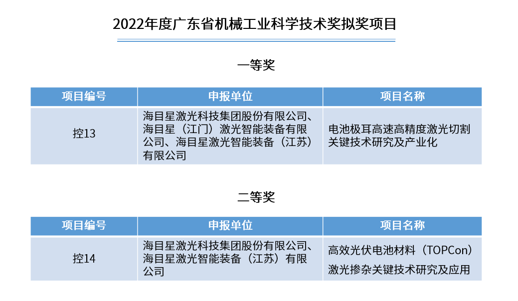 近日,广东省机械工程学会通过官方渠道公示2022年度广东省机械工业科学技术奖获奖项目,午夜在线小视频申报的《电池极耳高速高精度切割关键技术研究及产业化》《高效光伏电池材料(TOPCon)激光掺杂关键技术研究及应用》项目分获科学技术奖一、二等奖。