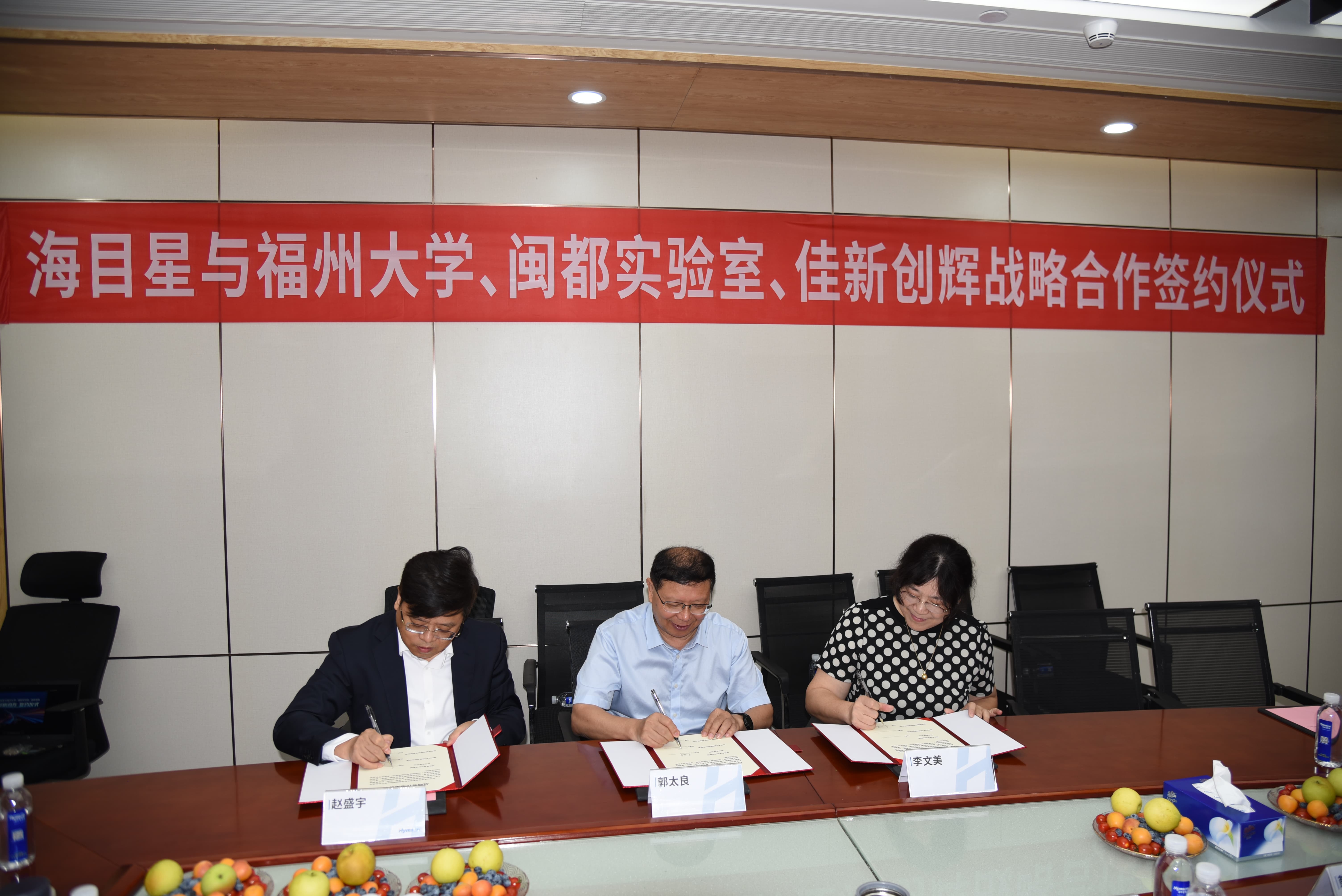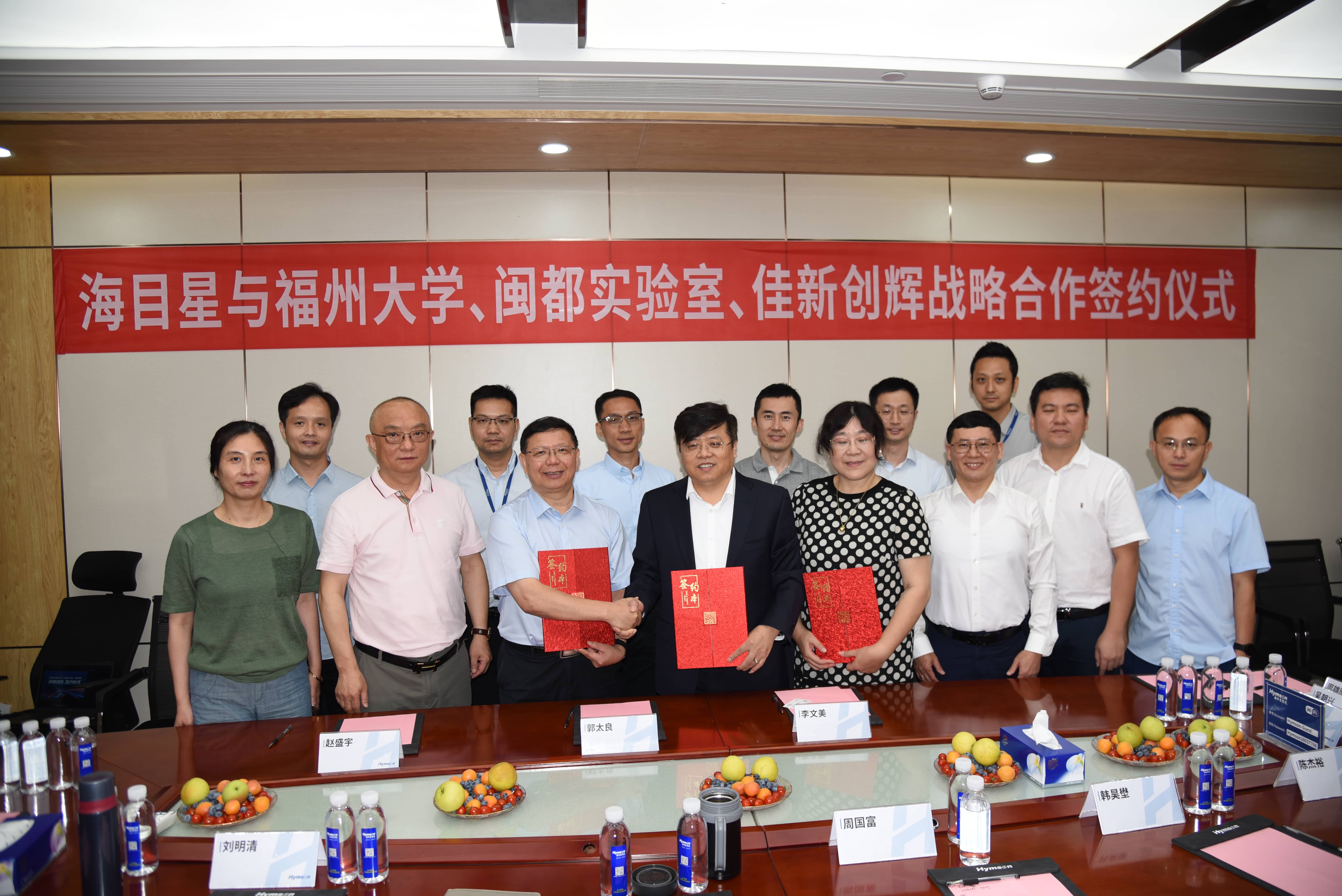签约现场,午夜在线小视频董事长赵盛宇与福州大学,闽都实验室代表郭太良教授,佳新创辉董事长李文美分别作为四方代表,共同签署战略合作协议,午夜在线小视频董事,首席科学家周国富教授,午夜在线小视频副总经理 午夜激情网站,首席人力战略官韩昊壄,午夜在线小视频3C行业中心总经理刘明清,午夜在线小视频3C行业中心新产品孵化部副总经理梁祖薪,以及福州大学吴朝兴教授等一行代表受邀出席并见证签约。